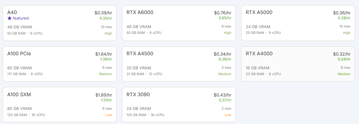 - Runpod displays different GPU options (e.g., NVIDIA RTX 3090, A10, A100, etc.) with varying prices and performance.